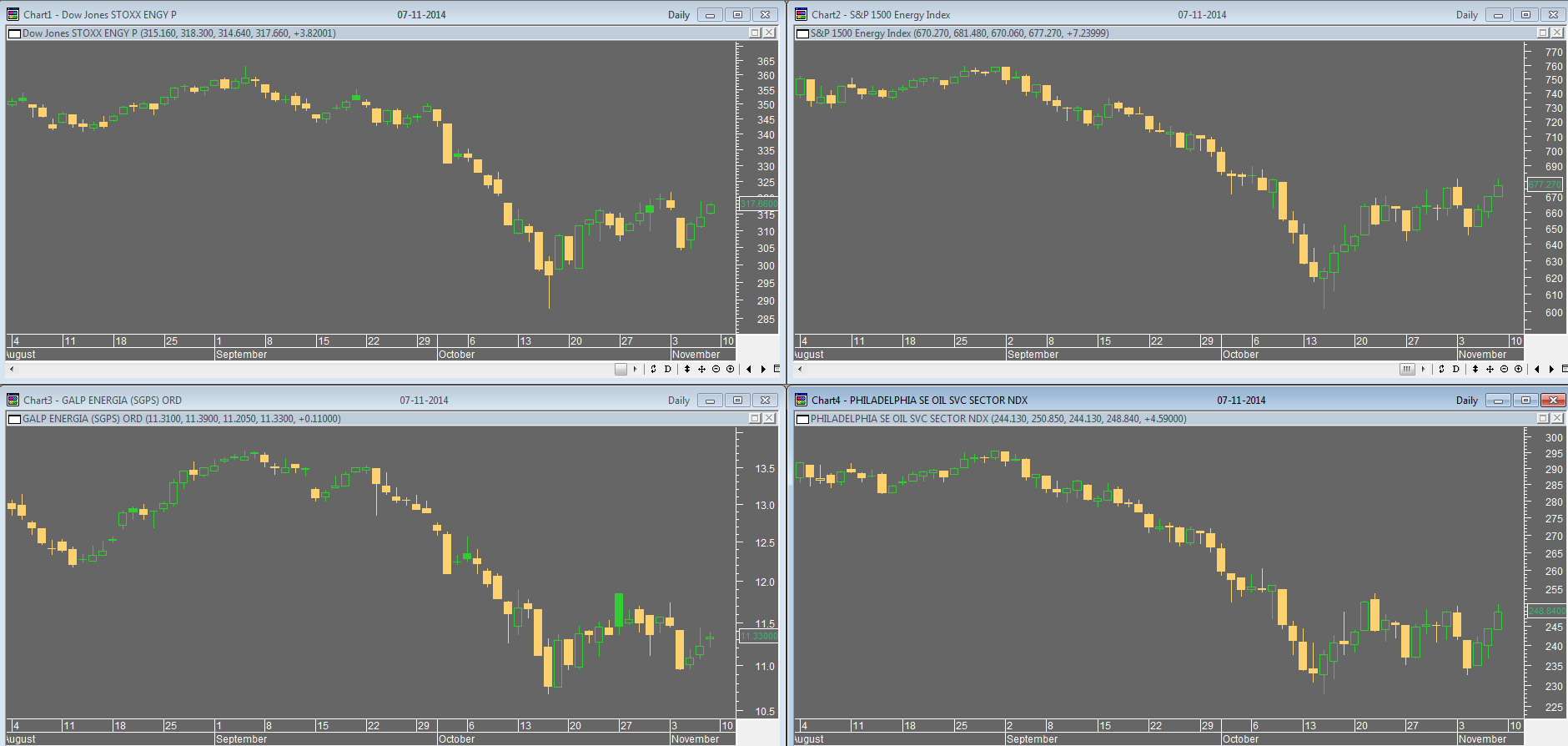 no sentido dos ponteiros do relógio: o super sector europeu da energia, a indústria norte-americana da energia, o índice do petróleo Filadélfia e a Galp
