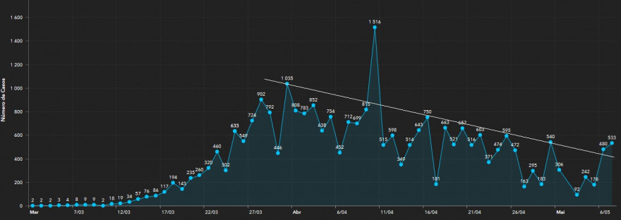 Por agora temos então 3 dias consecutivos acima da tendência descendente. Pelo que sei, corrijam-me se estiver errado, ficou definido na reunião com os especialistas de que caso ocorressem 5 dias consecutivos com mais de 500 novos casos diários que o calendário de desconfinamento teria de ser revisto e adiado.
