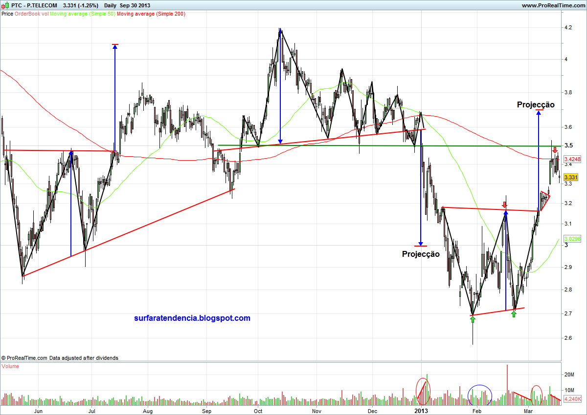 Havendo uma forte resistência nos 3,5€, dificilmente a cotação a ultrapassará sem vir um pouco mais abaixo tomar fôlego primeiro. Eventualmente até à zona dos 3.15€, que é onde poderemos encontrar um ténue suporte. Se vier a essa zona talvez se justifique uma tentativa de entrada longa, apostando numa inversão de tendência secundária. Haverá sinais suficientes de que esta inversão pode estar a dar-se? Alguns, não os suficientes. Repare-se no que aconteceu no ano passado, com a formação de um padrão em tudo semelhante ao actual. Apesar de ter dado início a um ciclo ascendente e de ter sido cumprida a projecção, isso não foi suficiente para uma inversão de longo prazo nem para impedir que as cotações mergulhassem abaixo da linha de activação depois de terem arrancado em alta. Ainda assim, os sinais positivos existem e não devem ser ignorados! A juntarmos ao duplo fundo e ao padrão de volume temos outro sinal, a inversão do padrão de máximos/mínimos relativos, também à semelhança do que aconteceu há um ano atrás.
