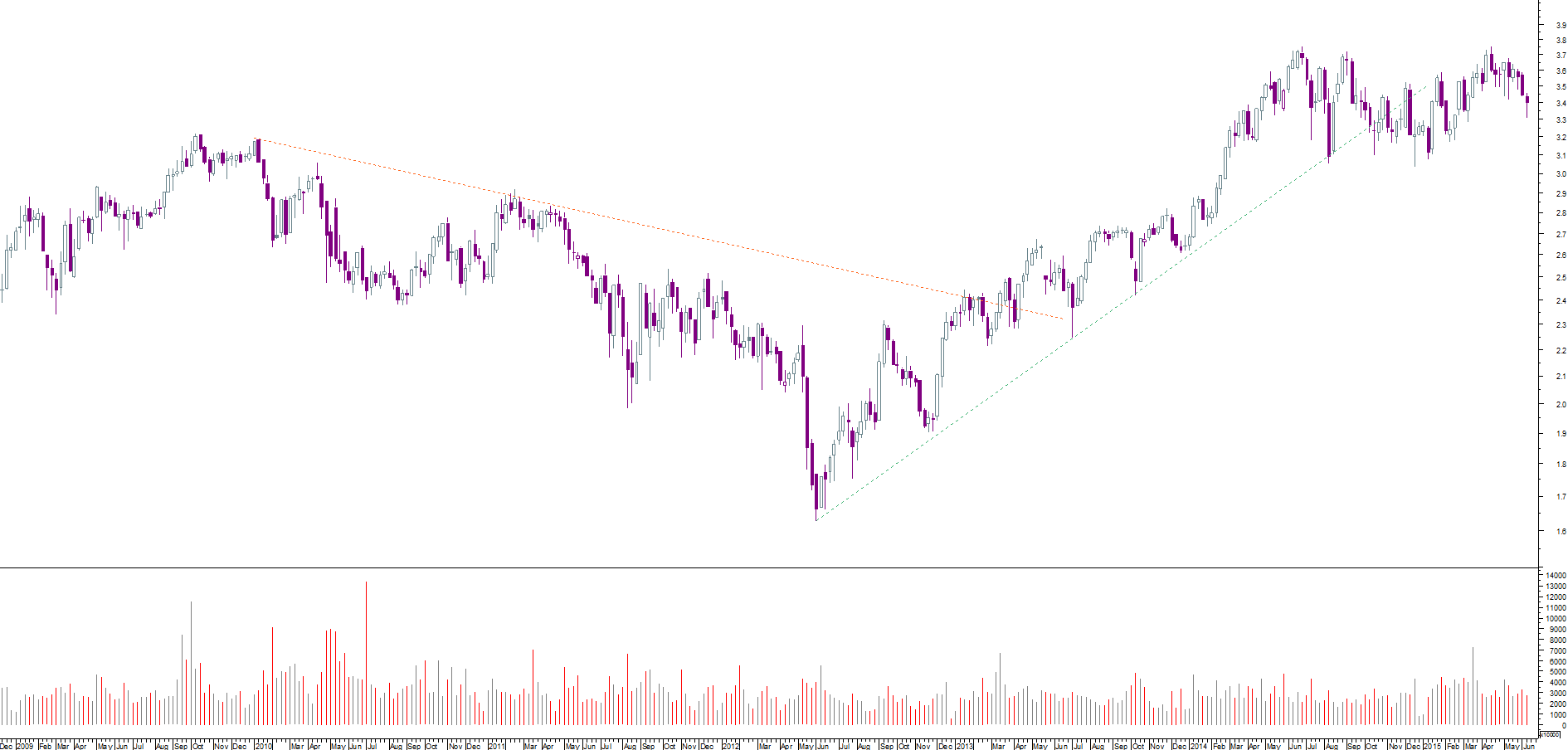 Por todas as razões a EDP parece consolidar e agora procurar caminhar para a resistência dos 3,75. A linha de tendência ascendente vem de Maio de 2012 e muito prolongada.