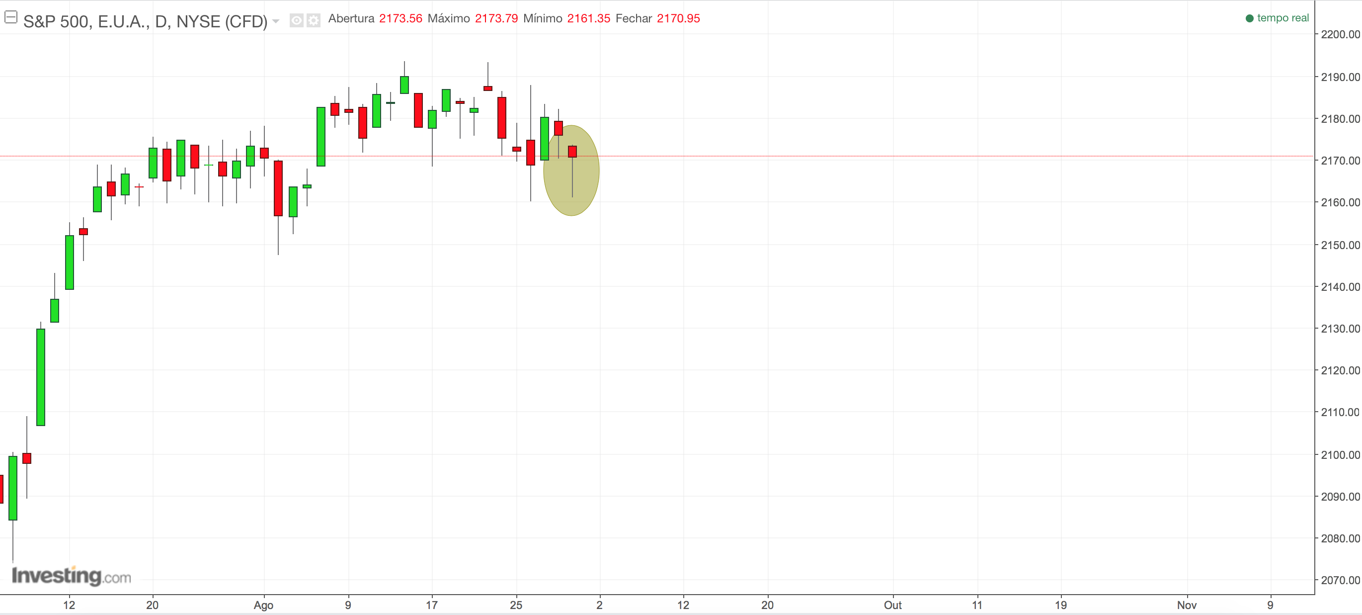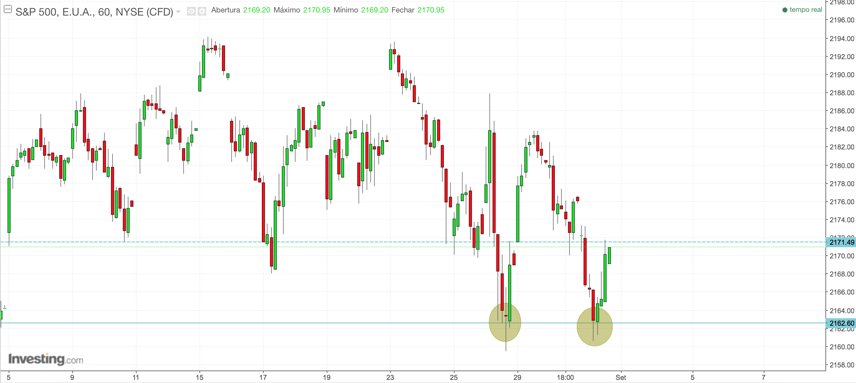 Repara no "duplo fundo" aos 2162, com boa recuperação. Pode ter ido testar no final do dia o anterior suporte aproximadamente aos 2171 e regressar às quedas, mas o martelo na vela diária de hoje parece indicar para cima... Vamos ver.