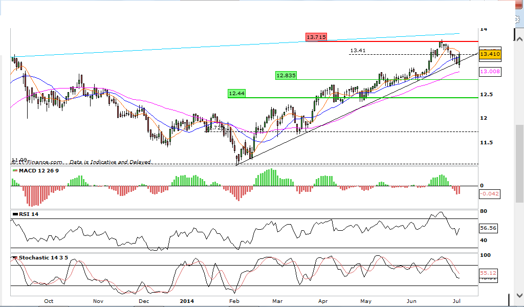 A cotação nos últimos dias tem lateralizado entre 13,30 e 13,40