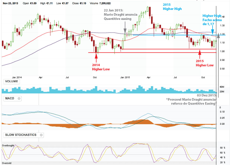 Com Higher Highs e Higher Lows em 2014 e 2015, e provavel novo reforço de QE a 3 Dezembro, 2015 por parte de M.Draghi, os mercados europeus e o "PSI18" deverão reagir forte, e a Sonae por norma acompanha.