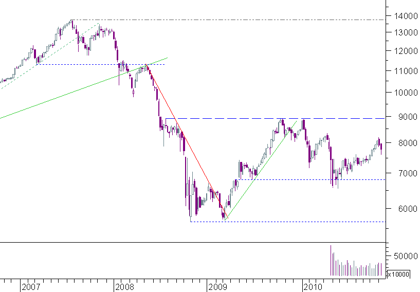 olhando o gráfico semanal do PSI 20 apercebemo-nos de que a tendência de médio prazo continua bearish: altos cada vez mais baixos, e o mesmo com os fundos - resta ver aonde parará esta correcção