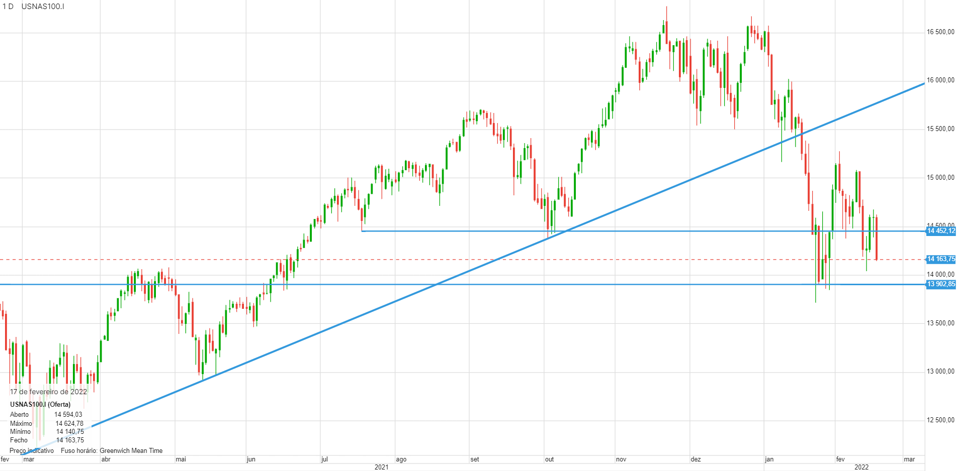 depois de uma correcção de 17,91% desde os máximos de novembro, com o índice a testar a importante zona de suporte dos 14000-14500 pts, com os indicadores de momentum sobre vendidos, com a MACD a apresentar leitura semelhante à apresentada aquando do bear market terminado em março de 2020, é muito provável que o índice tenha a estes valores um ponto de inflexão no seu sentido e inicie aqui uma nova up leg e continue a desenvolver o seu bull market, apesar de ter uma contagem activa no seu gráfico diário 50x3 point&figure nos 12600pts.
