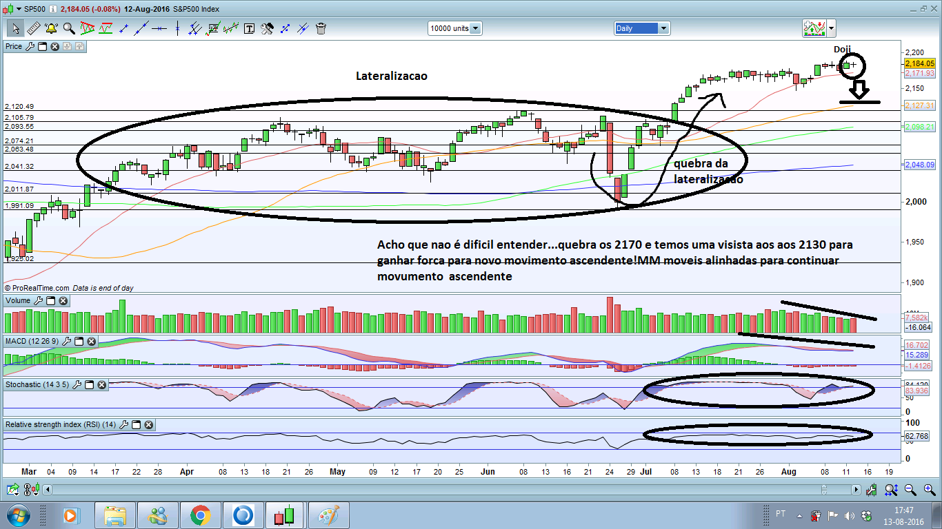 Voltando ao SP, depois de ter alcançado máximos de sempre, está a corrigir devendo estar-mos atentos como primeiro objectivo aos anteriores máximos em redor dos 2135, onde tem probabilidade de ressaltar para novos máximos.