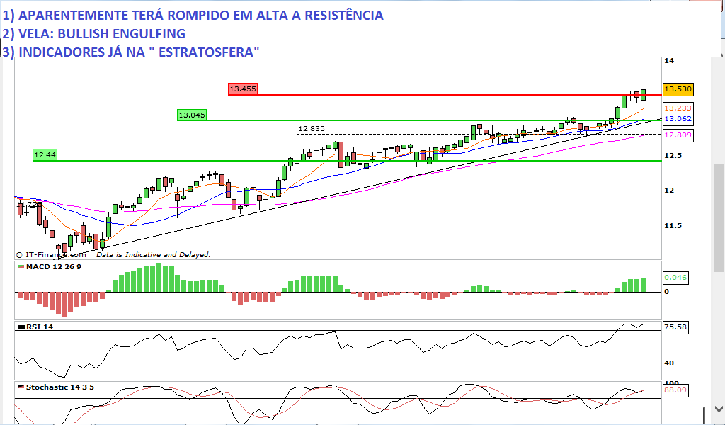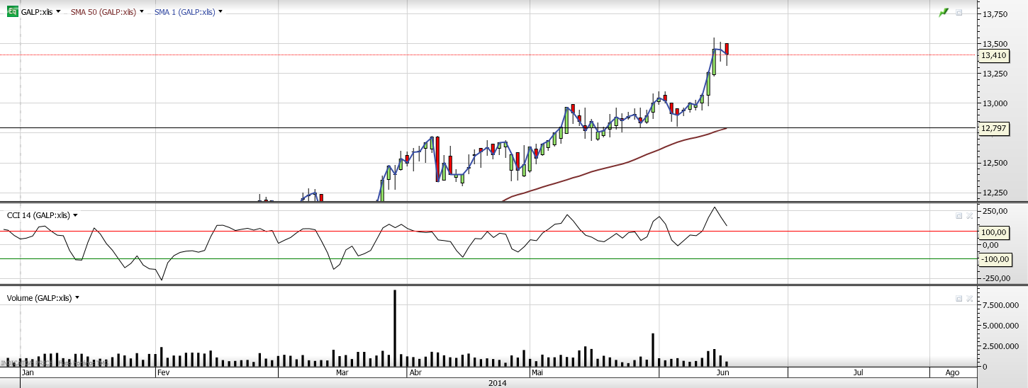Será interessante verificar se a Galp irá testar a zona da antiga resistência entre os 13 e 13,4. Esse será o grande teste para se verificar se a ruptura foi ou não consistente (e ajudará a aliviar os indicadores de sobrecompra).