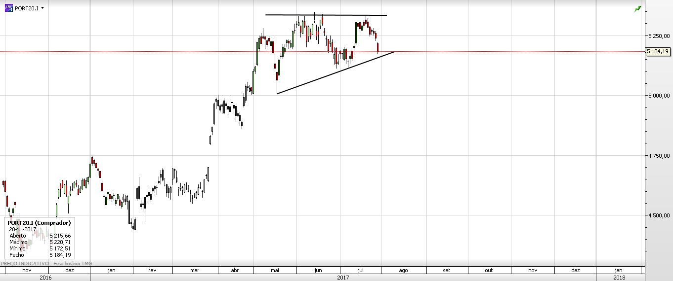 Da minha parte mantenho que um cenário provável seja ver o PSI a marinar por umas semanas ou uns meses nesta faixa ou "flag" dos 5000 aos 5350 pontos, ou seja, a lateralizar.