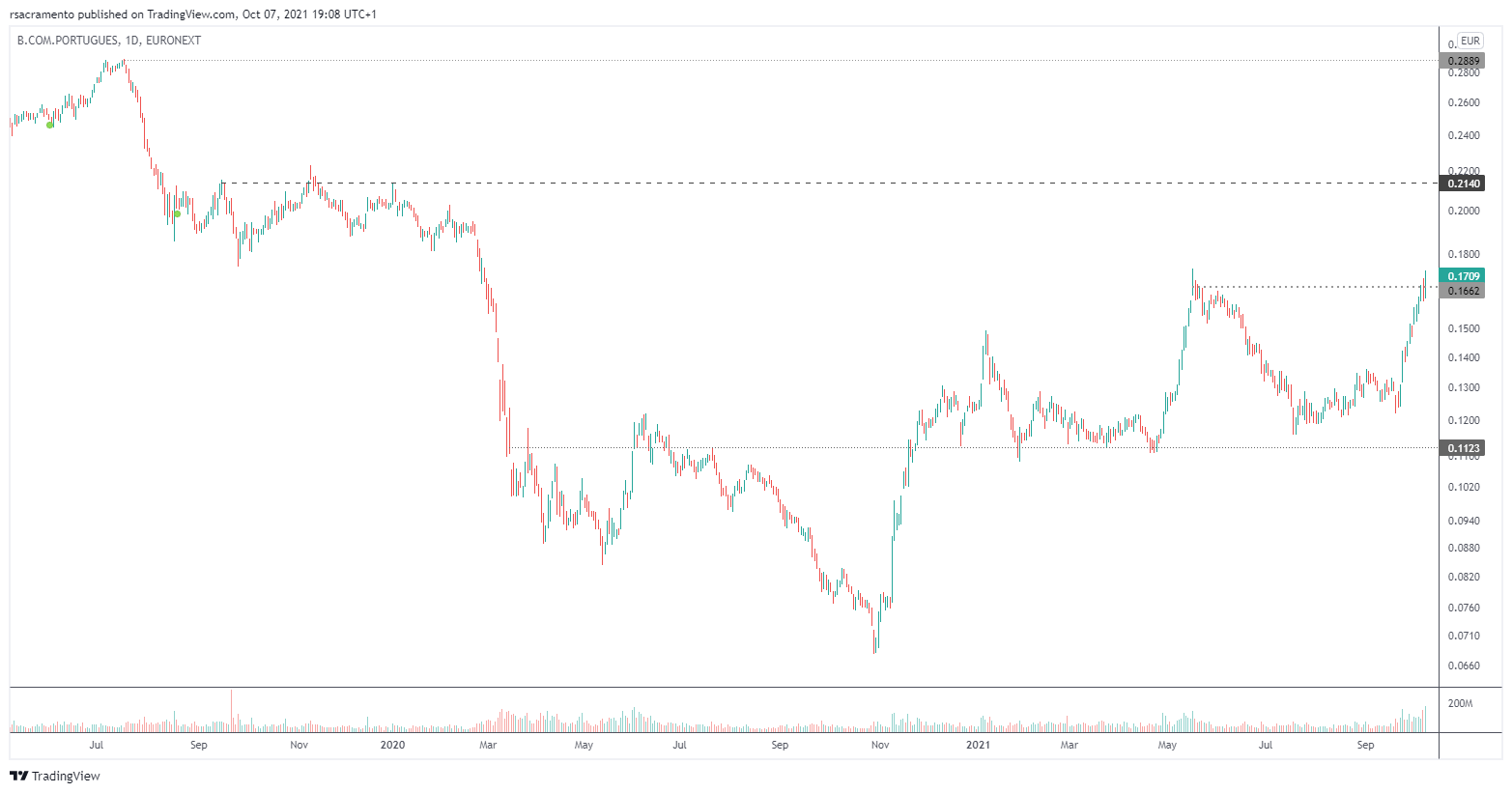 Como eu desenho o movimento: por agora, irá até à zona dos 0,1750, depois retrocede com quedas já significativas tipo 2% para os 0,15/0,16, entretanto saem os resultados em 27 de outubro, e a partir daí arranca de novo para termos o Natal nos 0,20/0,2150. Eu gostava de estar certo...