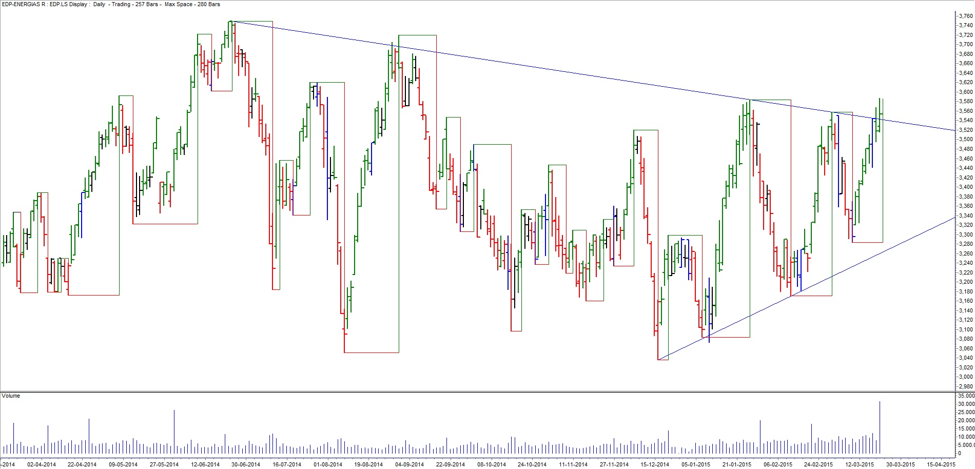 Já confirmei o fecho e confere com o valor 3,553, contudo deixo o gráfico da minha plataforma e penso que ainda estamos dentro do valor da tendência, com mais tempo irei confirmar o volume numa outra plataforma.