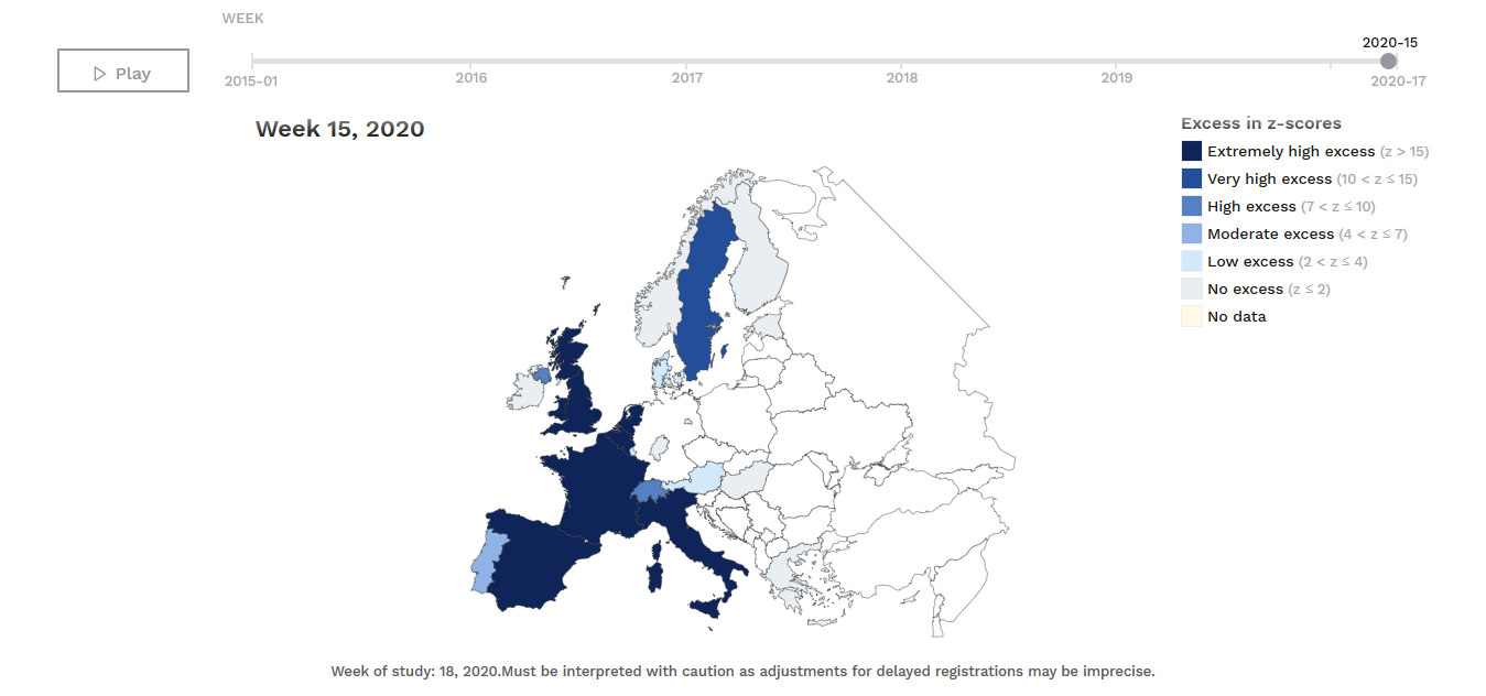 Na parte dos gráficos e mapas tem uma ferramenta fantástica que vai "pintando" os países com os niveis de excesso de mortalidade ao longo do tempo, semana a semana, desde 2015.