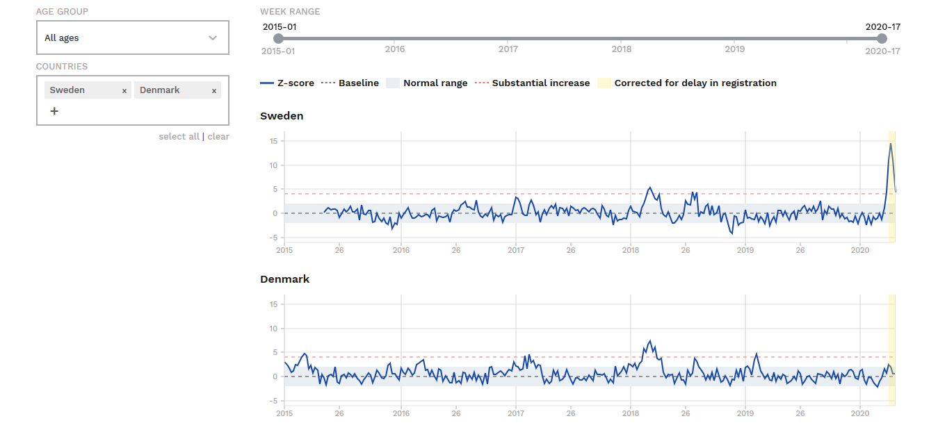 Para perceber qual o impacto em fazer lockdown (e não só) ou não fazer, deixo mais este gráfico onde é possível verificar as diferenças entre 2 países que tem curvas de mortalidade semelhantes, excepto no COVID-19, isto porque a Dinamarca tomou medidas mais limitativas do que a Suécia.