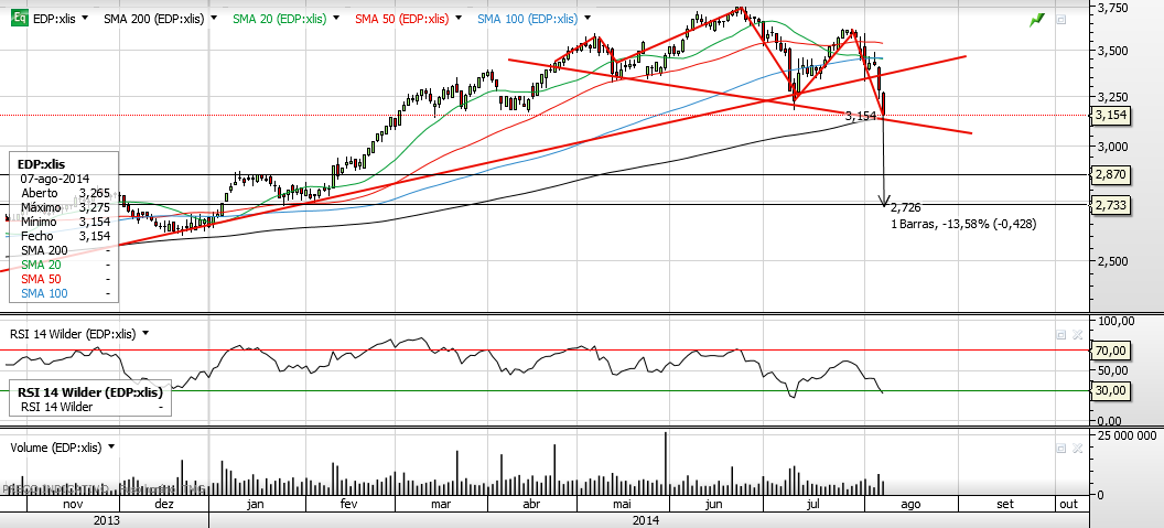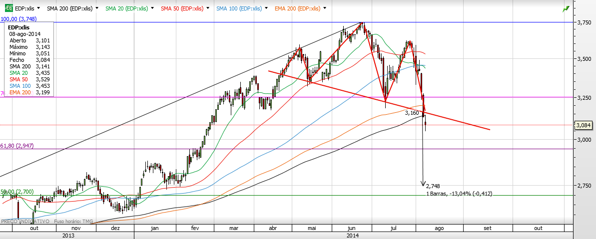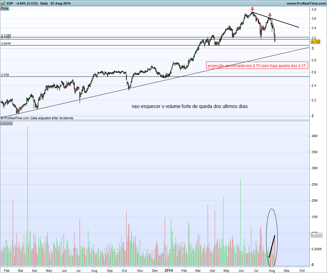 Olá amigos boa noite. pela minha análise o h&S foi activado na quebra do suporte importante de 3.17. Neste momento fechamos num valor abaixo do suporte, mas perto de outro suporte que é os 3.05. pela minha análise vem aproximadamente aos 2.75 mas claro com um ressalto pelo meio. vamos aguardar o dia de amanha que vai ser importante para perceber se o suporte aguentou ou não.Com o volume crescente nas descidas penso que o caminho continua para sul. Neste momento para entrada longa tinha de quebrar o máximo anterior que se encontra nos 3.60 aproximadamente, até lá nem pensar. abraço e boas apostas
