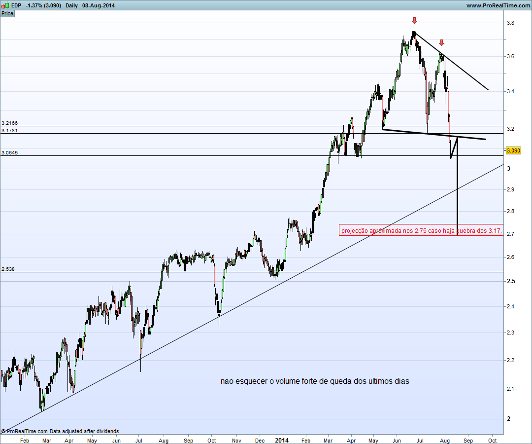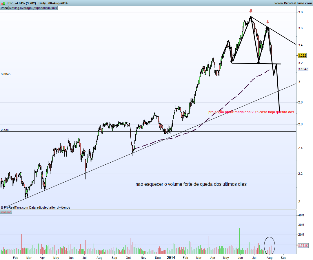 Os 3,05 na minha opinião nao tem qualquer relevancia, mas um nao ajusto o grafico a dividendos, penso tambem que poderá de facto dar-se um pullback, logo que nao ultrapasse o ultimo lower-high a força continua do lado dos curtos