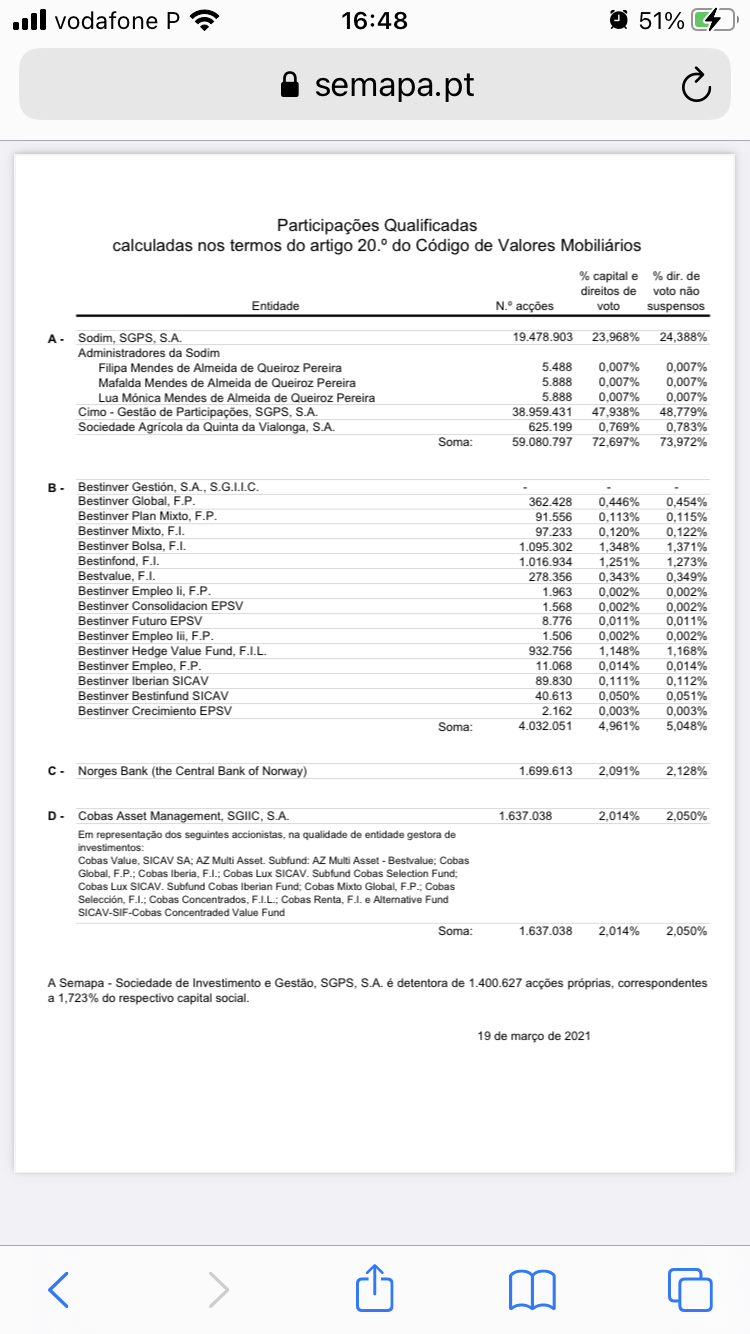 Segundo edit: não estou assim tão maluco. As posições qualificadas comunicadas pela semapa a 19/03/2021 dão 5% a Bestinvester, quando a venda dos 2% foi feita em 2020. Isso é legal?