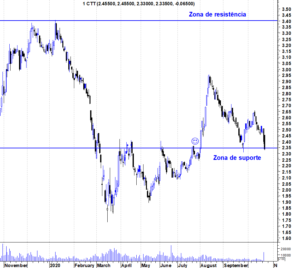 Ulisses Pereira Escreveu:Com a queda forte de hoje, os CTT estão a testar a importante zona de suporte entre os 2,30/2,35. Deixo o gráfico actualizado onde é bem visível a actual situação técnica da acção.