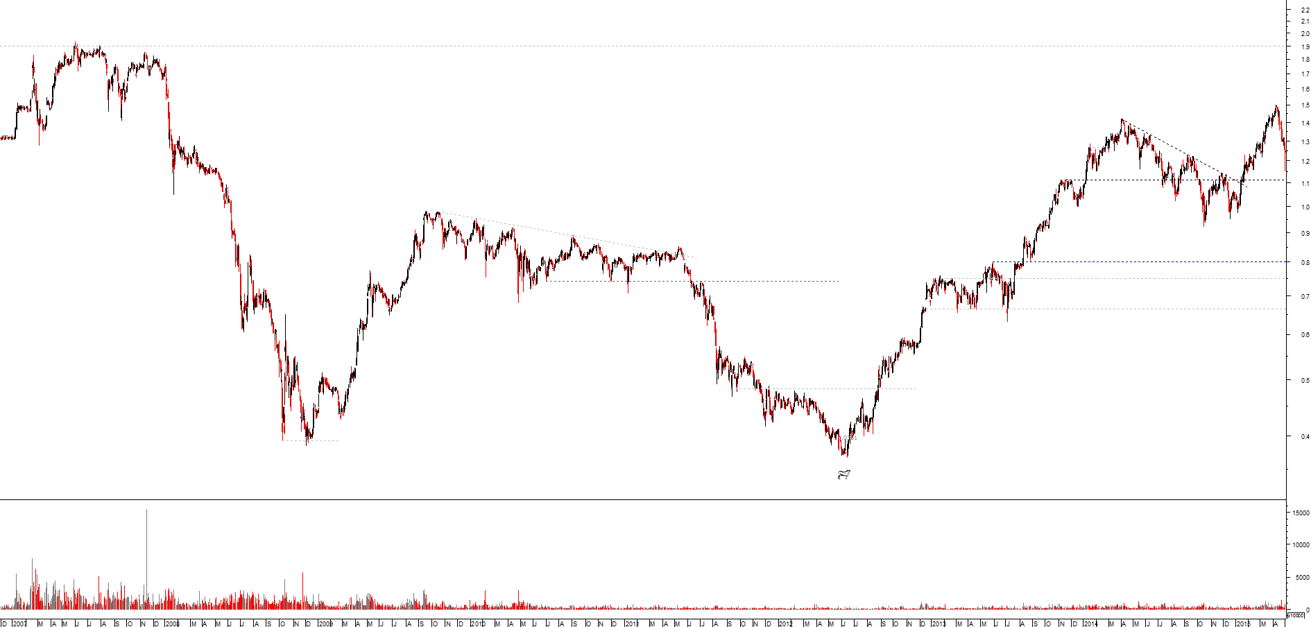Antes do pico de 2007 e da queda pós cisão os mínimos de Dez.-Jan. 2006 e de Jun. 2006 foram de cerca de 1,17.