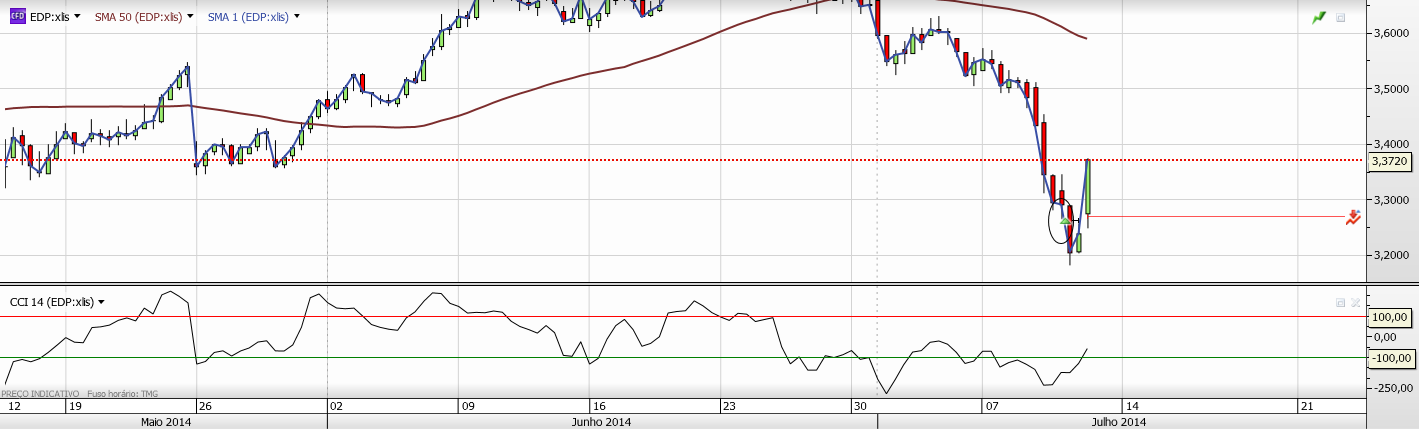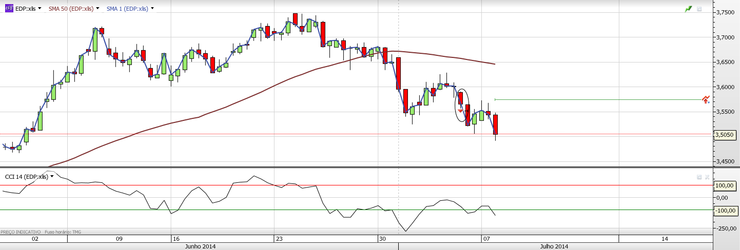 Neste momento, o RSI indica que a EDP está oversold, por isso não me admirava um pullback até à linha vermelha. A acontecer, a reação a essa zona irá ditar a trajectória de CP da EDP. Um quebra com volume pode significar que os touros tomaram novamente o controlo e eu desfaço me da posição curta. A ausencia de quebra pode significar uma continuação das quedas no CP, e eu posso até reforçar posição.