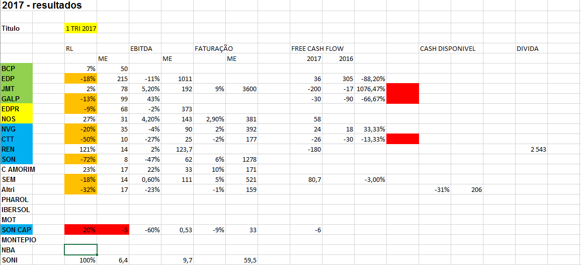Após praticamente todas as cotadas relevantes do PSI20, já terem anunciado resultados do 1º TRI de 2017, com algumas exceções existe uma queda significativa dos resultados e indicadores financeiros.