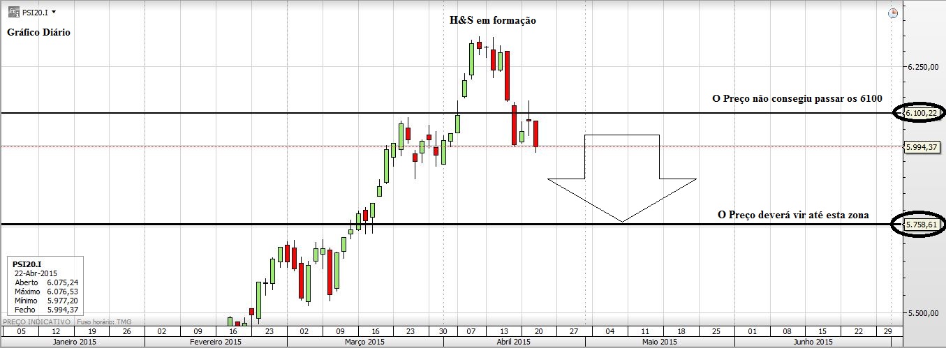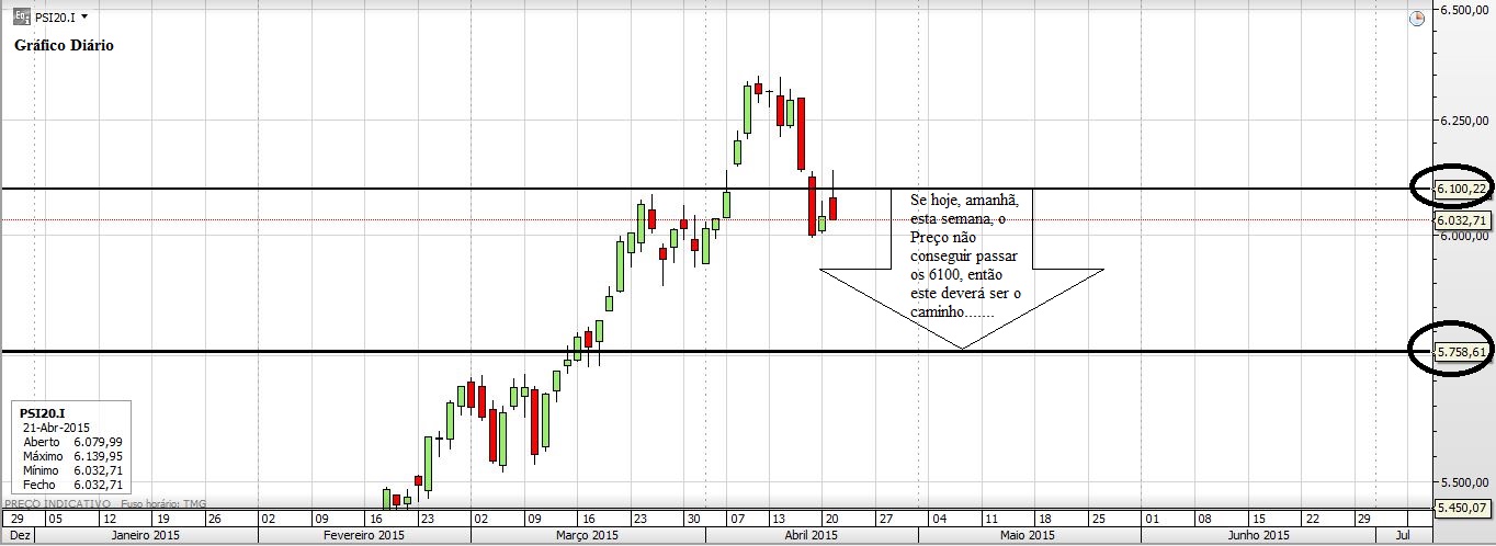 Longe de mim também ser um especialista em H&S (ou de AT, aliás, cada vez vou sabendo que sei menos)(falando a propósito do gráfico mais acima do PSI). Agora, o que acontece é que o Preço andou ali a tentar furar os 6100, encheu os pulmões e lá foi ele por ali acima... porém levou umas marretadas, até que levou uma mais forte e baixou a crista, despenhando-se por ai abaixo... depois lá voltou mais de mansinho a erguer-se para ir de novo aos 6100 mas, mal começou a levantar a crista... pimba, outra marretada... agora o Preço está meio zombie... anda ali à espera de se estatelar, talvez ainda fique neste estado mais umas sessões, talvez de tão embriagado ainda tente mais uma vez ir aos 6100... mas depois cai para o lado...