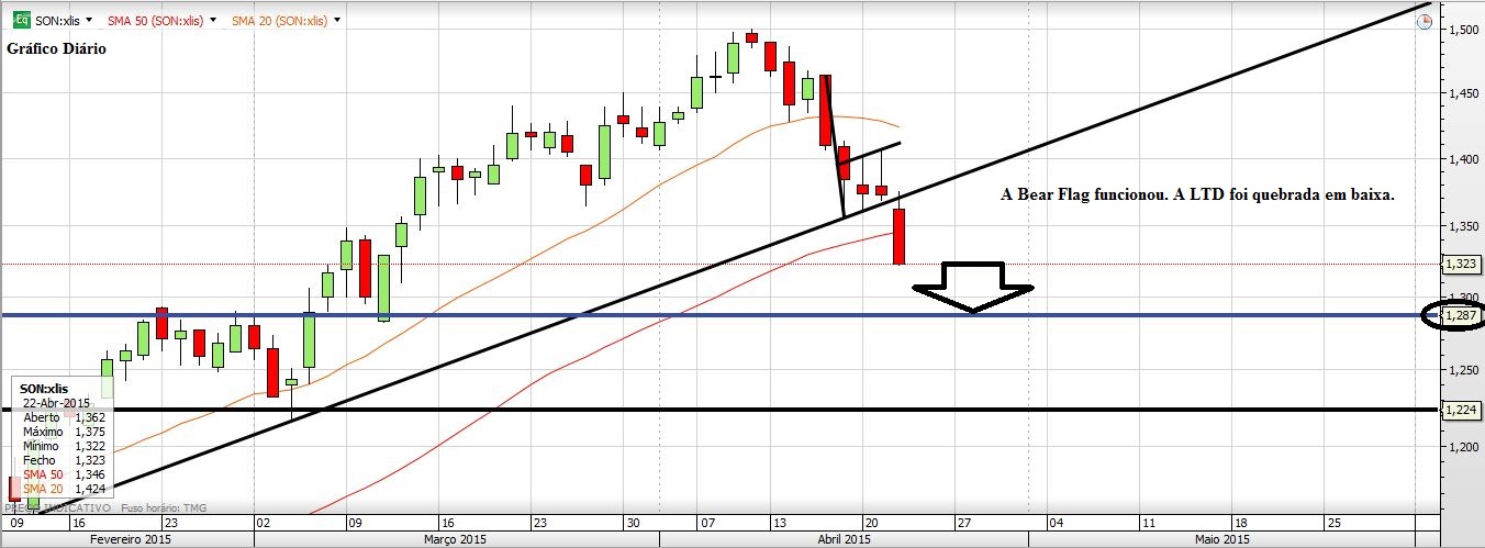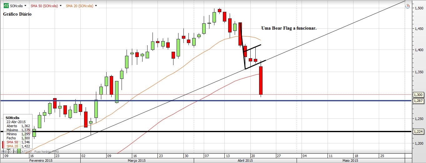 A SONAE caiu porque sim. De qualquer das maneiras estava uma Bear Flag a alertar para o risco, que ainda por cima estava por cima de uma frágil LTA. Agora será natural uma recuperaçãozinha, porém acho que o Preço, apesar de já ter atingido o target da bandeira, ainda deverá ir á zona compreendida entre os 1,287 e os 1,224. Essa é que será uma zona de maior suporte. Como não tenho pressa nenhuma vou esperar que o Preço lá chegue para ser um acionista da SONAE.