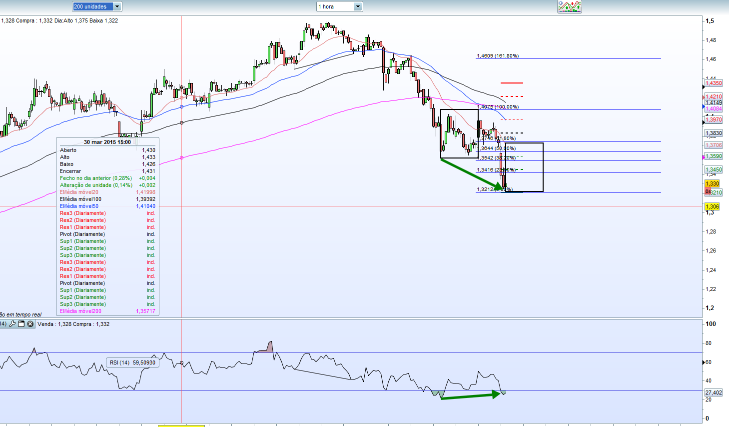 3- Existe uma divergência bulish no 1h em formação com projecção a 1,373 (que também corresponde aos 61,8% Fibonacci).