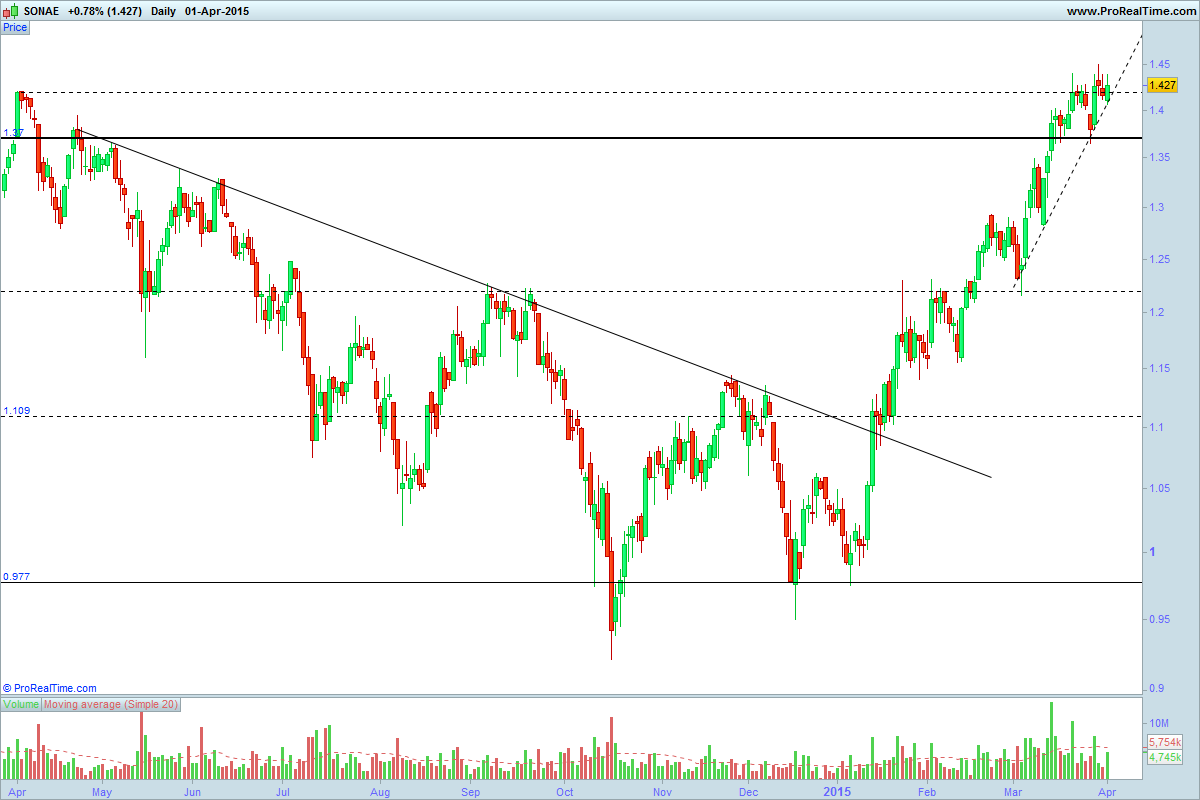 Entrei hoje na Sonae, aparentemente quebrou de forma consistente a resistência de 1,42.