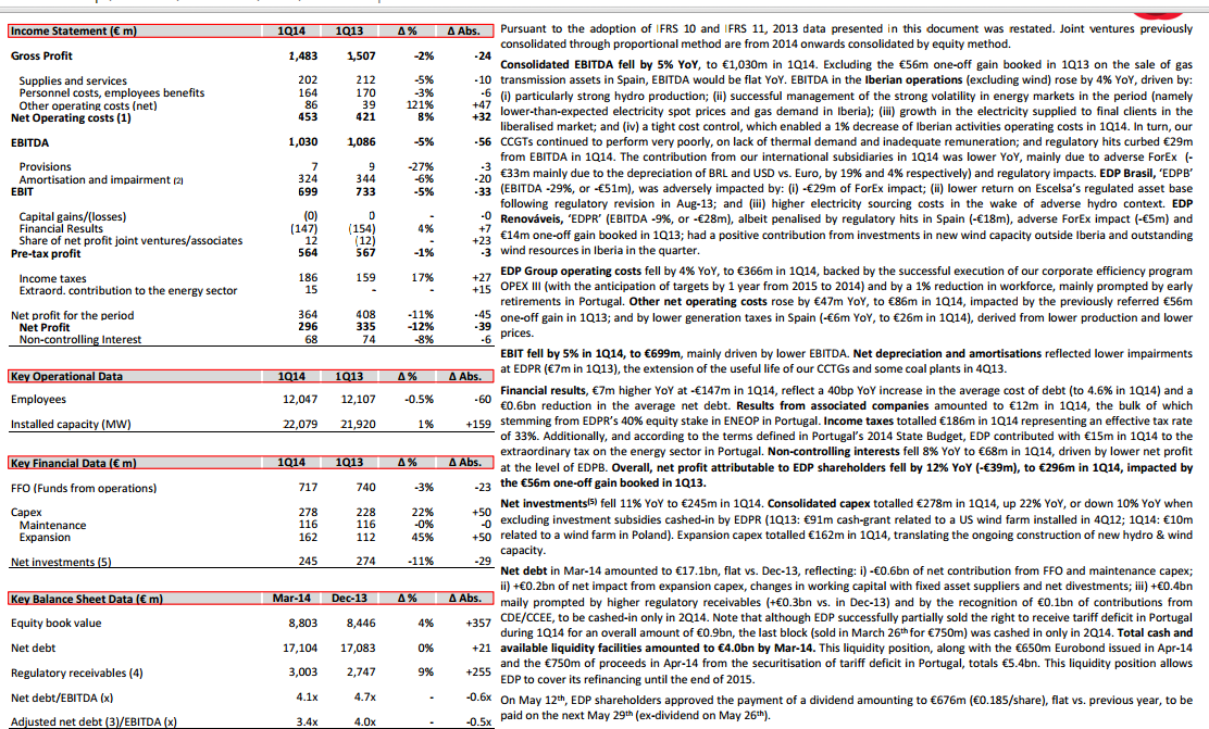 o que me parece bom. convem lembrar que o fx do real tirou 33m de euros de ebitda à edp), pelo que LFF estes resultados são bons, os FFO caiem 23m nada de muito extraordinario... resumindo parece me uma boa base, é pena a questão do rating, mas vamos esperar por amanha no entanto mantenho o target antes do dividendo de 3,55 acredito que estes resultados se olhados com a devida atenção sao solidos num ambiente regulatorio e de fx que tirou 62m( 33m fx, 29m na iberia) e ainda houve 15m de contribuição extraordinaria....A edp parece me resiliente mas poderá enfrentar mais tareia em espanha.... muito brevemente dai que não subo mais o target ( o defice tarifario lá continua a dar que falar....), previsão para 2014 resultado líquido entre 940-980 milhoes de eurosRetificaçãoA divida liquida ebitda cai porque o Q1 é o melhor numa electrica e o comparativo é feito com o ebitda do Q4.. logo o net debt/ebitda será flat