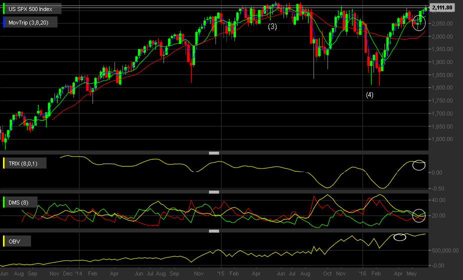 Pelos finais de Março,principio de Abril que o adx saiu da venda neste indice,acompanhado pela fortissima acumulacao que tem acompanhando pelo indicador OBV.Dias mais tarde o trix rompeu em positivo o eixo 0,confirmando o inicio das compras.