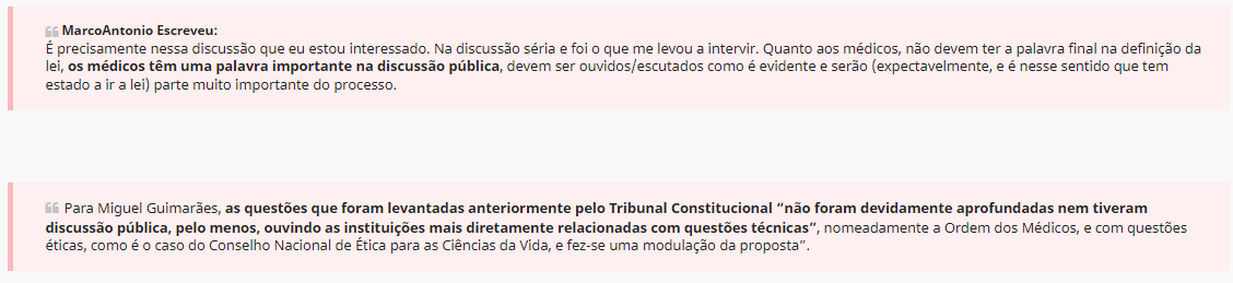 Não fiz qualquer tipo de avaliação/qualificação sobre quão bem isso ocorreu e muito menos teci qualquer tipo de insistência e não entendo a tua necessidade de fabricar isto. Escrevi sobre qual deve ser no meu entender o papel dos médicos (e de outros) à luz do que tu escreveste antes. O que é abundantemente claro dos dois textos é que os dois individuos acreditam no mesmo princípio (os médicos devem ser ouvidos / dar pareceres e que não devem ser os únicos). Nenhum dos individuos acredita que compete aos médicos (ou outros) terem a palavra final, que foi sobre o que opinei. Não compete aos médicos legislar por nós e para nós, como não compete aos atletas legislar sobre desporto ou coisa que o valha, isso não é democracia ou a democracia que eu preconizo, isso parece-me mais uma forma qualquer de corporativismo, nem sei bem. Mas de democrático tem muito pouco.