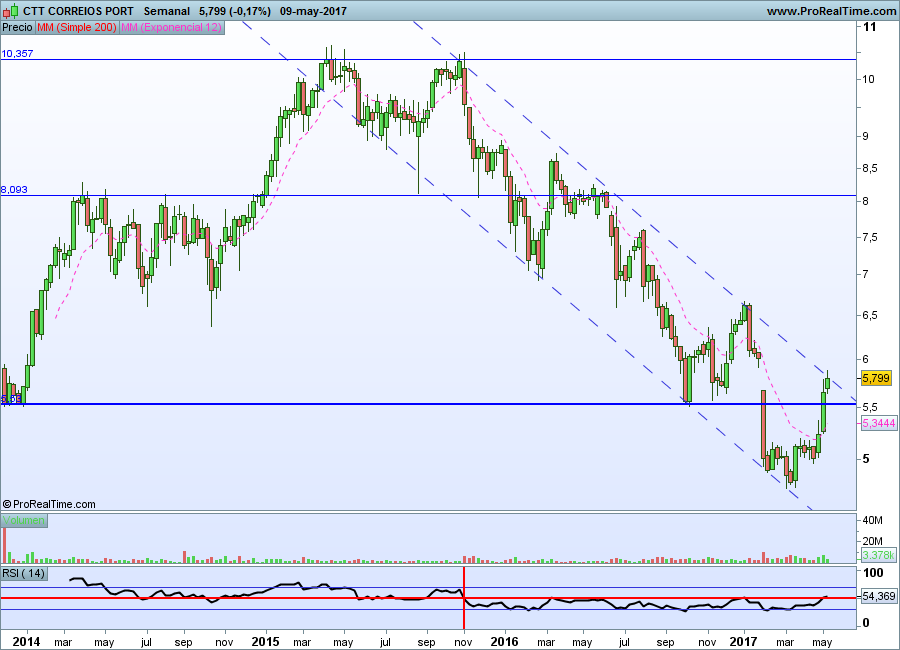 O tiro de partida de médio prazo foi dado ao romper a resistência na casa dos 5.50/5.55, contudo a aproximação do pagamento de dividendos, estar a cotar junto à linha superior do canal descendente de longo prazo e ainda cotar próximo da MM200 pode fazer com que a cotação lateralise alguns dias ou faça uma visita a resistência