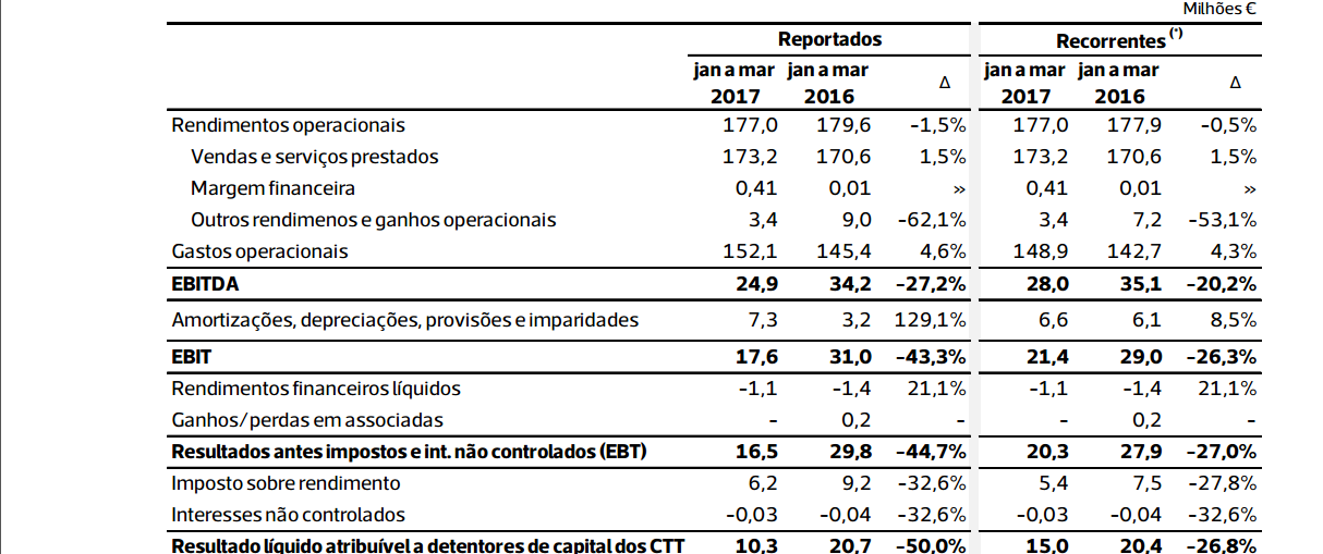 1º TRIMESTRE POSITIVO: O indicador cash flow das actividades operacionais (excluindo a variação líquida de credores de serviços financeiros), aumentou de 17,6 M€ no 1º trimestre de 2016 para 70,6 M€ no 1º trimestre de 2017". (free cash flow operacional ajustado de 17,2 M€). Activo aumentou 2,7%, capital próprio aumentou 4,7%, passivo só aumentou 2,3% (sobretudo devido ao aumento de depósitos de clientes). DY9,2%/dividend 48 cents, é passível de manter-se em 2018 (ver importante ponto 6).