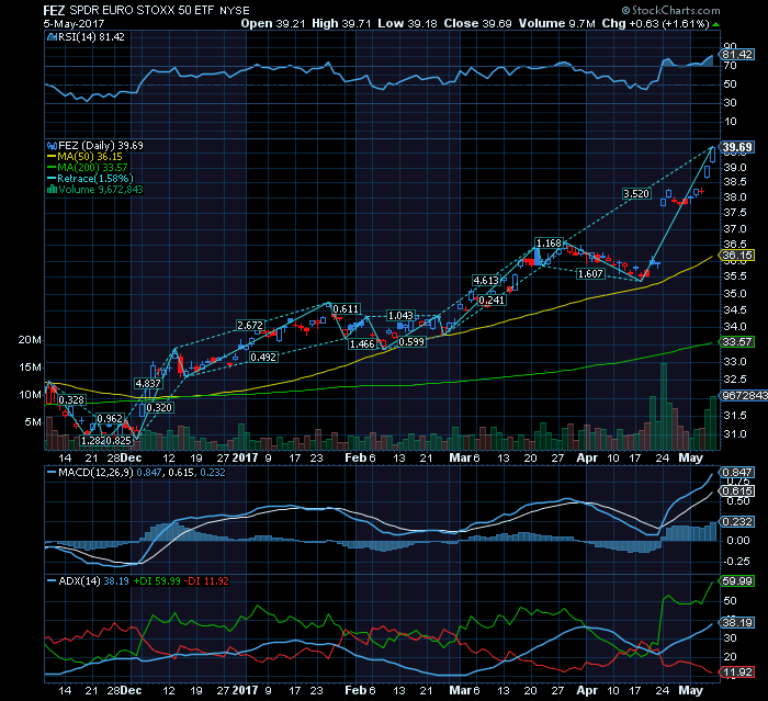 Com a Vitória de Macron podemos ter um life span reforçado para o Bull Europeu (já descontado o efeito ascendente de curto prazo nas Bolsas mas incólume no longo prazo): 1ª na Banca (política expansionista do crédito/investimento/consumo+mutualização da dívida); 2ª Grande Consumo (bases anteriores garantindo uma subida média do PIB UE acima de 1,5%); 3ª Construtoras de Obras públicas e particulares (crédito e confiança do consumidor levará França, Portugal e Espanha a mais uma leg up mimetizando UK de há dois anos atrás); 4ª Energias renováveis; 5ª Auto(embora com postcipações de compras para elétricos da 3ª geração em 2018); 6ª Comércio retalhista e telecomunicações. Macron mais do que uma vitória Francesa representa o novo estado de espírito Europeu, o da Confiança! (na UE, nas sociedades e nos Mercados)