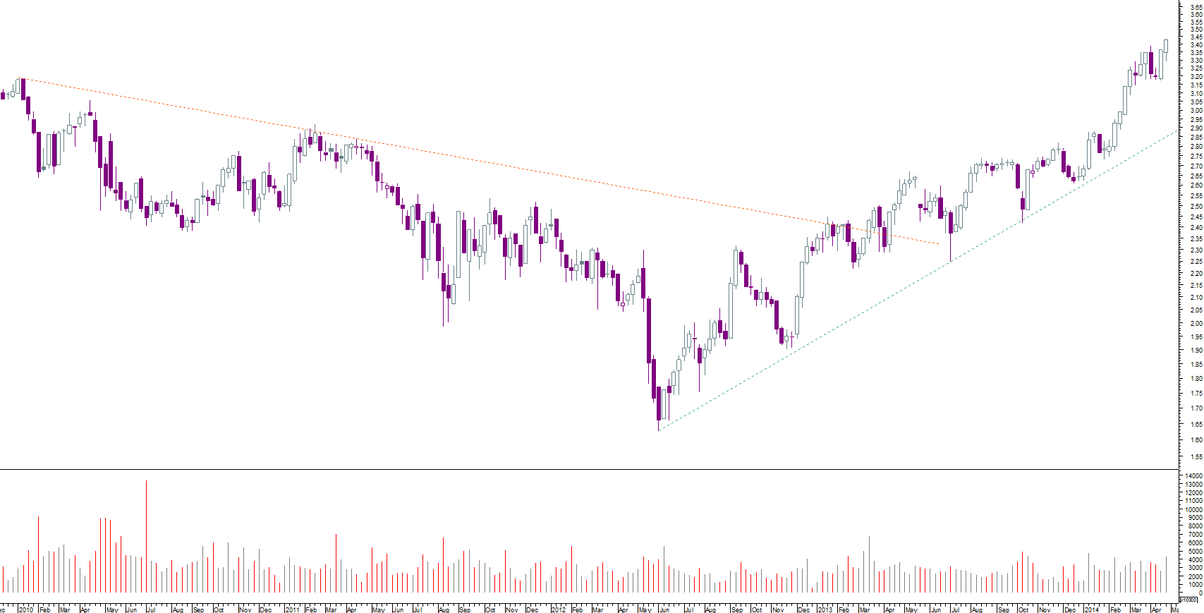 Em Abril de 2008, depois de uma descida e subida a 3.20 ( ver gráfico), desce 50%. 3,20 não deixa de ser um suporte, no meu ponto de vista! Entrei na sexta feira, sabendo que se encontrava longe da LT, mas junto de um suporte! Abraço