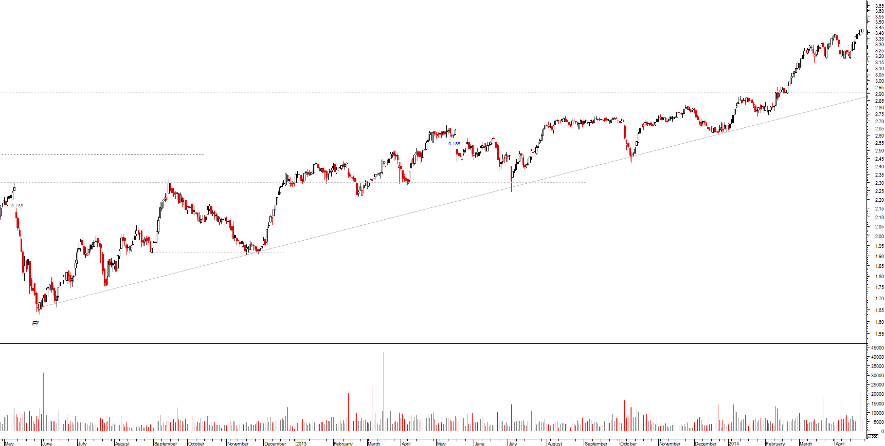 A forma como os €3,20 se aguentaram surpreenderam-me, note que a cotação suportou grandes "despejos" nas últimas semanas. Considerando que a viagem dos €2,80 aos €3,20 foi muito rápida, estava preparado para um visita aos €3,00, mas nada disso aconteceu. Os gráficos mostram uma aceleração no ritmo de subida após os €2,80.