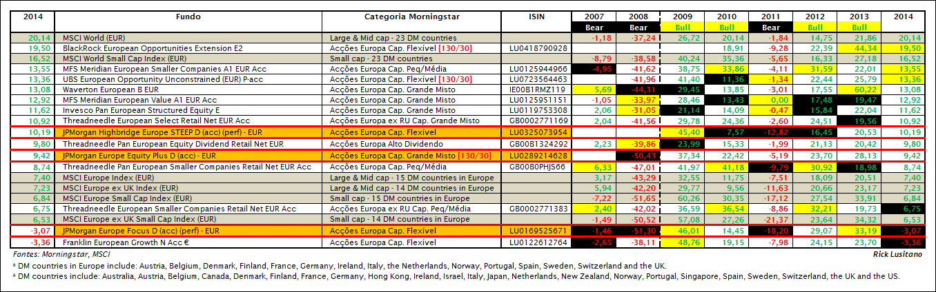 Como és 1 Homem que gosta de números e estatísticas, deixo este quadro dedicado ás rentabilidades dos fundos de Acções Europa, ordenado de forma decrescente pela rentabilidade em 2014, que inclui os meus Top 150, os teus 3 fundos da JPMorgan e os índices da MSCI em EUR, o World (23 DM), o Europe (15 DM) e o Europe ex UK (14 DM), tanto em Large & MId Caps e Small Caps. Inclui as várias capitalizações, por causa da flexibilidade das políticas de investimento de alguns fundos: