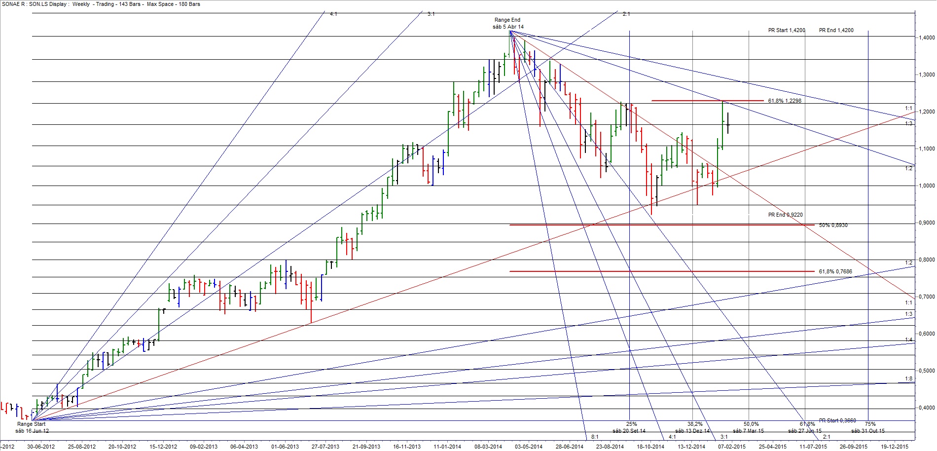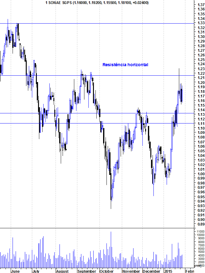 Aqui ficam os gráficos actualizados da Sonae, depois da sua natural reacção em baixa à importante resistência horizontal entre os 1,21 e os 1,22 euros.