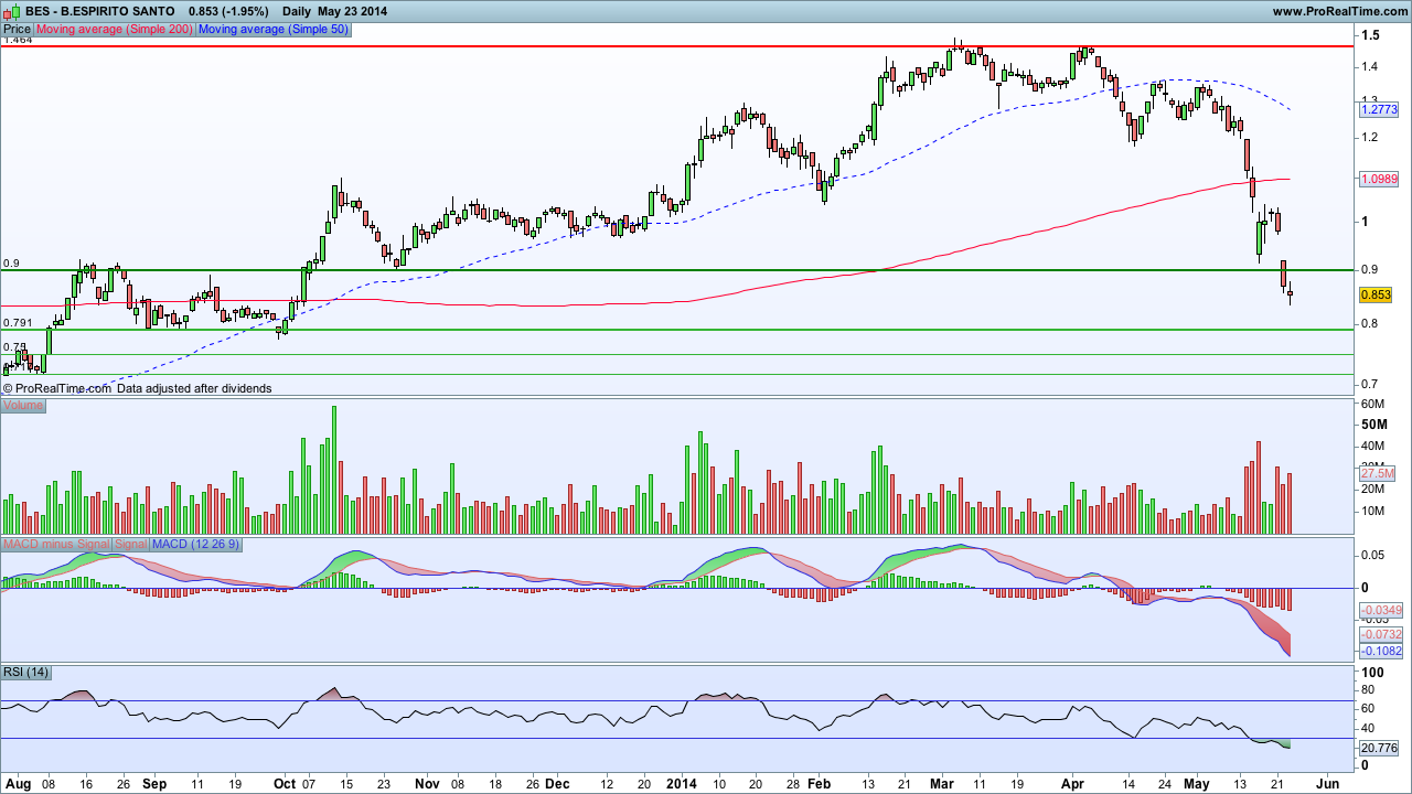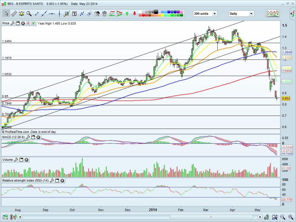 De acordo com o gráfico, o BES tem um suporte aos valores atuais, mas uma quebra é bem capaz de o levar aos 0,78€ (direitos a 5,2 cêntimos). E uma hecatombe atira-o aos 0,70€ (direitos ao módico valor de 2 cêntimos). Confiram, p.f, mais abaixo.