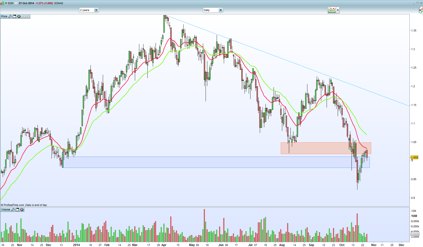 Digo de forma consistente porque esta linha de tendência está traçada em zonas de acumulação. Teria de haver uma fuga clara á linha para Sul para considerar que foi rompida.