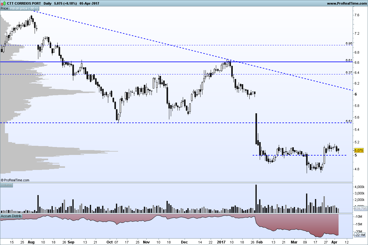 CTT Mega bear de Longo e médio prazo, após 16 meses de quedas consecutivas (de 10,5 a 4,7€), nos últimos 2,5 meses lateralizaram num canal estreito (SF 4.75 / RF 5.15), com um beta mínimo e inusitado (face à volatilidade nos 3 meses precedentes).