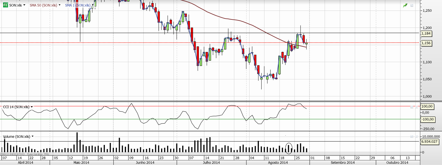 Rejeitou a resistência acima e veio á SMA50; ou veio ganhar força ou vai quebrar, estou mais para quebrar, vamos ver