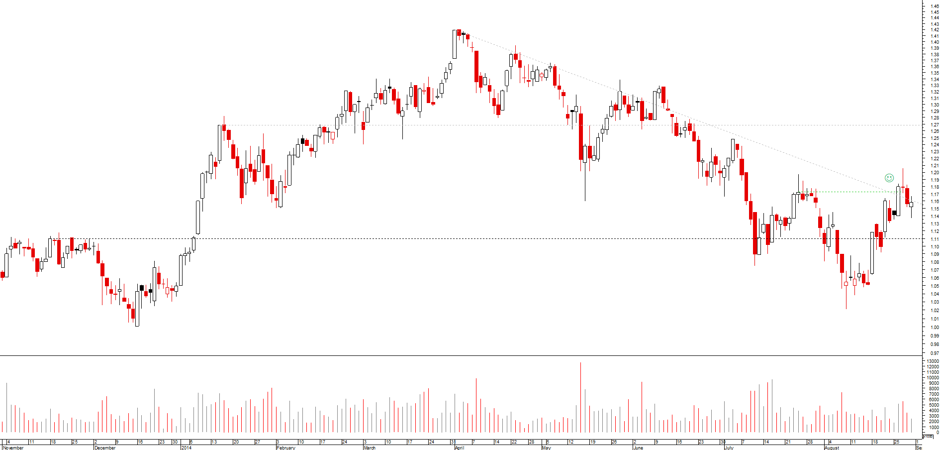 o toque nos 1,14€ foi inevitavel...nao tava À espera é que depois desse assim aquele pulo no final da sessao...o que foi bom...volume nas quedas a descer...macd positiva mas atencao ao estocastico que pode começar a ficar cansado...quebras dos 1,14€ e 1,20€ sao para ser vistas com muito cuidado!