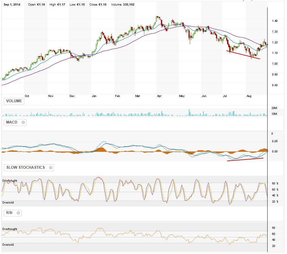Considero que o bottom foi atingido no dia 8 de Agosto, existindo uma clara divergencia no MACD e esta acima do RSI 50 e portanto a subir. Espero apenas a confirmacao no cruzamento da MM20 com a MM50.