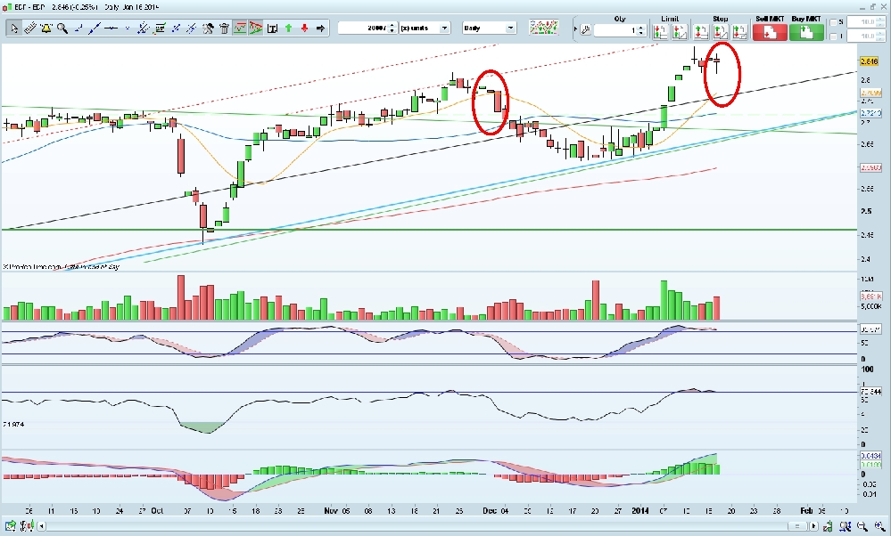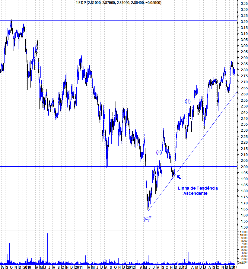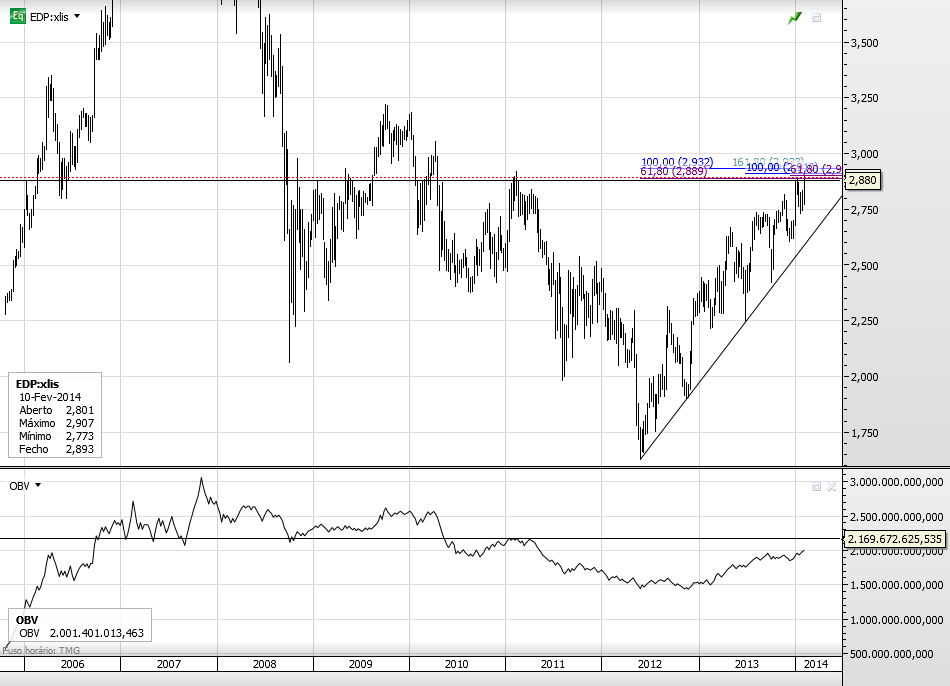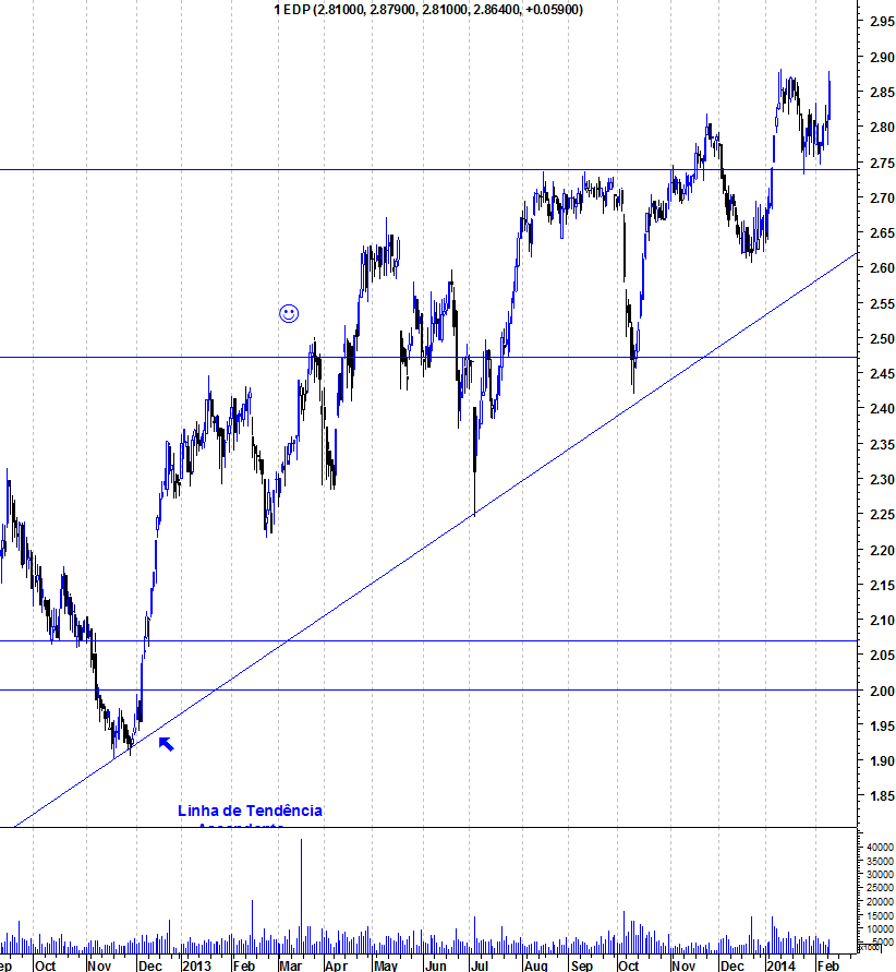 A EDP é uma das minhas preferidas para 2014... depois de a andar a seguir durante o dia, decidi entrar a 2,827, porque me parece que está a haver alguns sinais de força compradora. Pretendo reforçar se baixar deste valor. O facto de ser a minha preferida no longo prazo, não quer dizer que não a possa comprar e vender no curto-prazo, se assim o entender.