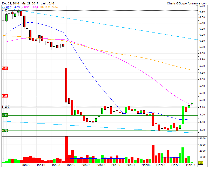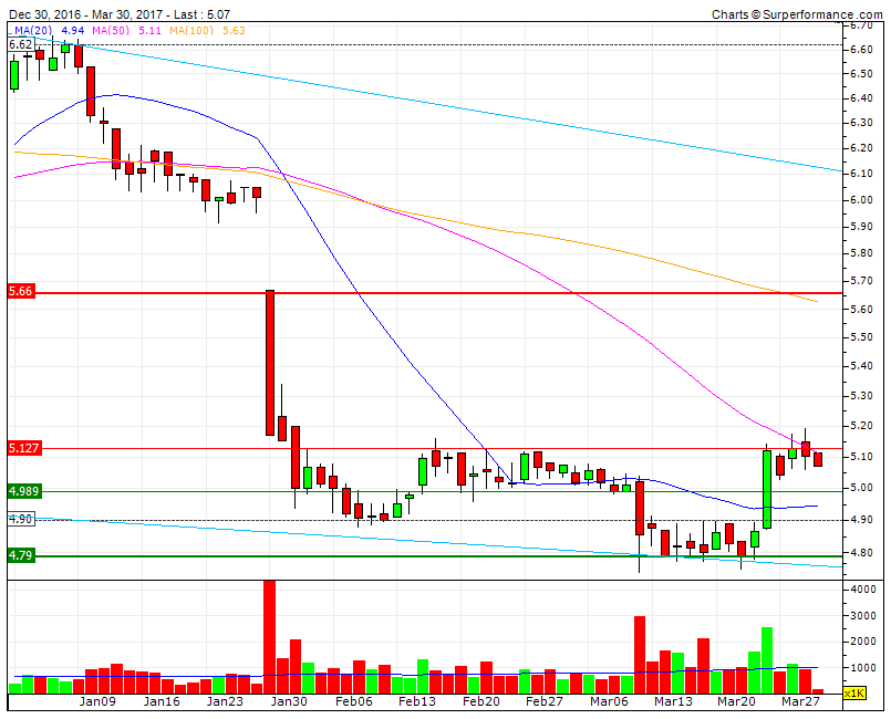 O cenário gráfico nos CTT continua desolador mas evidenciando uma expectável inversão - de Setembro de 2015, dos 10.5 aos 4.7 de Março, não conheceu um período de consolidação como o actual . O Maior Bear do Psi20 nos últimos 18 meses, falhou ontem o primeiro teste de inversão da tendência de médio prazo (na MMS50, hoje a 5.11), e hoje, com fraco volume e quebra os 5.10€ (SF), mantem-se num range apertado (cerca de 1%), o que demonstra a fraqueza relativa do título. Partindo do pressuposto que o início do 2º trimestre confirmará a alteração do status quo » sector rotation, resultados 1ºtrim e 48cents de dividendos, reforço com 3º e última posição CTT (compro pela 1ªvez acima dos 5€). Sem stop loss até 3 meses após dividendos, e time span máximo de 15 meses (2Xdividend), com reduções ou aumentos de posição em função da performance.