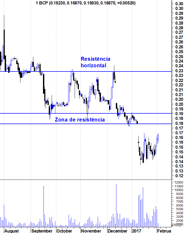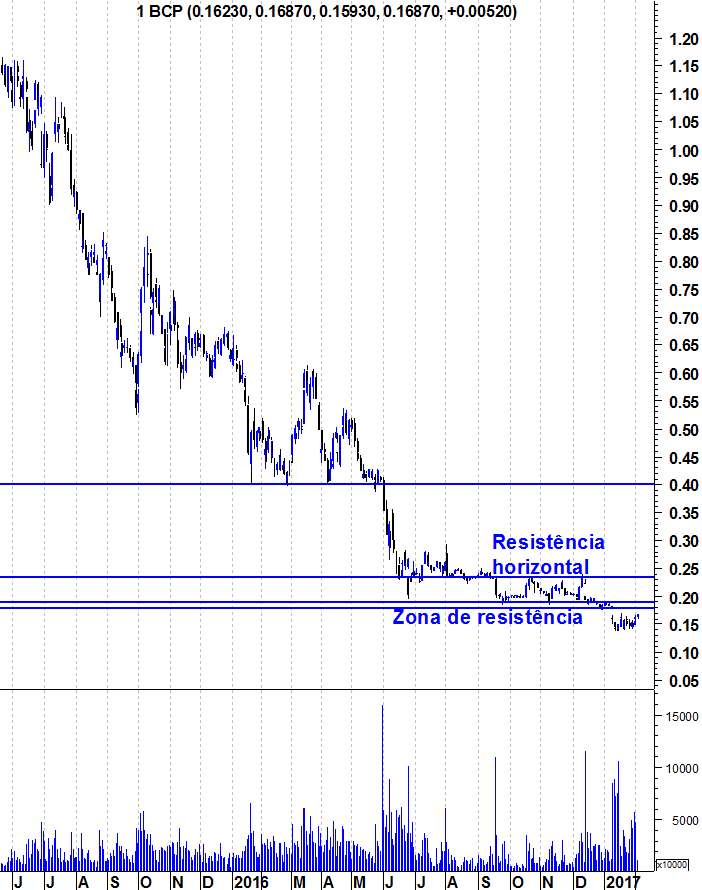Deixo aqui os gráficos actualizados do BCP (Já devidamente corrigidos de todos os aumentos de capital e "splits"). A resistência de curto prazo situa-se entre os 0,18 e os 0,19 e a grande resistência da acção na zona dos 0,235.
