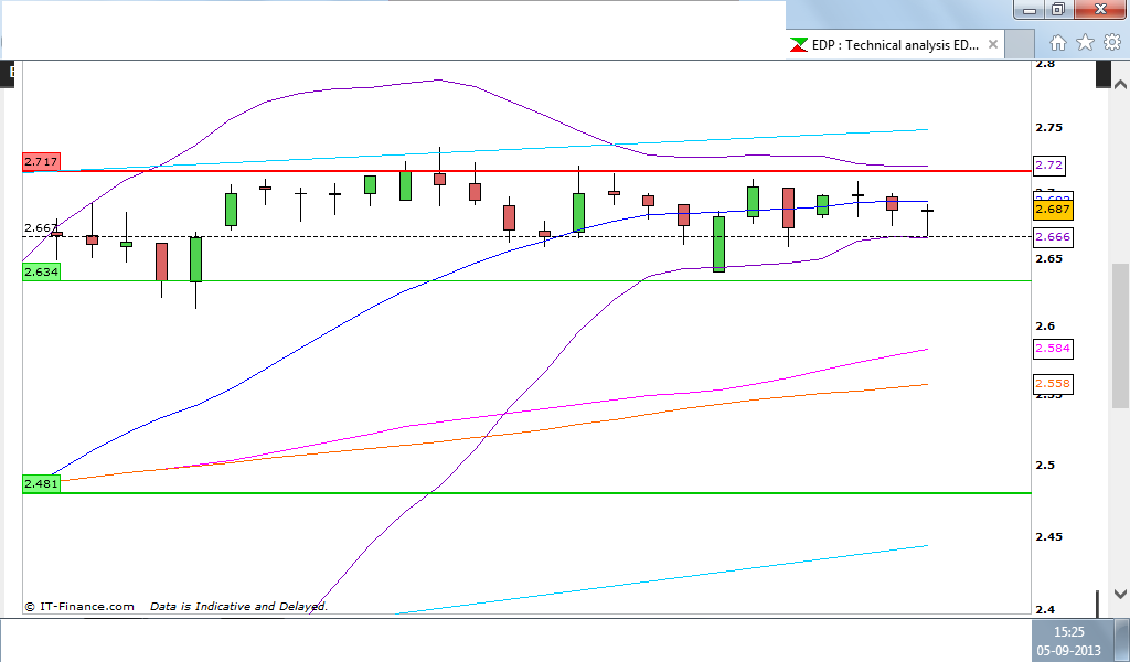 Molle tem cuidado, não sei se é boa ideia! A EDP praticamente está a subir desde junho de 2012, já leva 1,10€ valorização; está a bater o maximo atingido que foi 2,73€. Lá com a venda aos chineses ela empolgou-se. Agora, algum tempo estagnou. Por parte de noticias não são as mais favoráveis. Esta historia do estado querer mais dinheiro pelas barragens não sei? Só se os resultados mexer com a cotação, mas penso que só lá para finais de outubro é que há novidades!