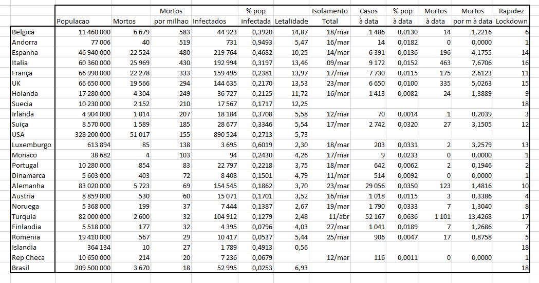 Na tua tabela, à data do lockdown, a Bélgica tinha 14 mortos a Noruega 7... a Bélgica 1,2 por Milhão de Habitantes, a Noruega 1,3....a Bélgica 0,39 de pop infetada, a Noruega 0,13... e tu colocas a Noruega no grupo dos que tomaram medidas tarde e a Bélgica nos que tomaram cedo?!?