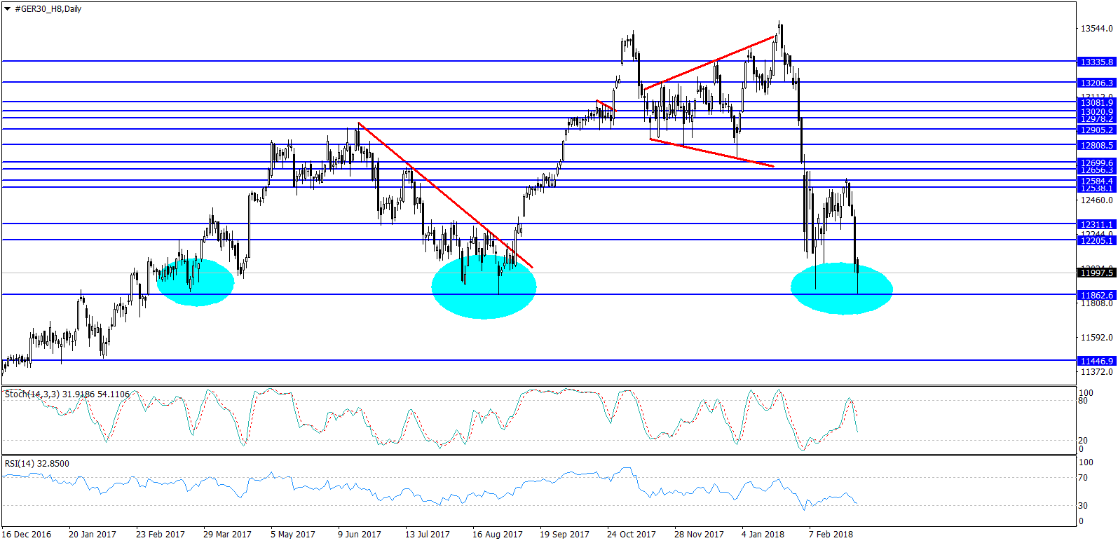 Se for dos 13600 aos 11870, temos os 38.2% perto dos 12500, os 50% perto dos 12700 e os 23.6% perto dos 12250.