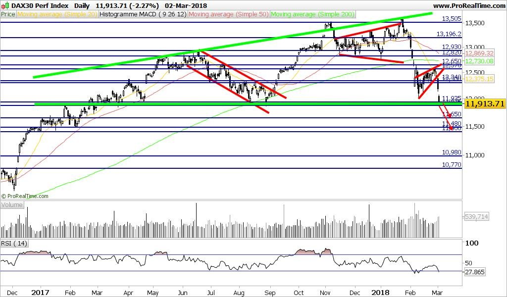 Inicio de semana atribulada e pouco habitual com futuros DAX em forte queda nos 11750 Pontos e abaixo do forte suporte 11900 e DOW a cair 200 Pontos